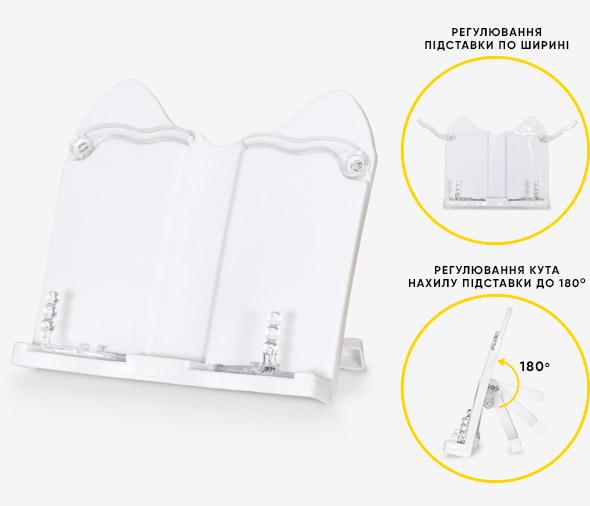 Переносна підставка із міцного пластику підлаштовується під розмір підручника і зошита, може змінювати кут нахилу та має затискачі для зручності